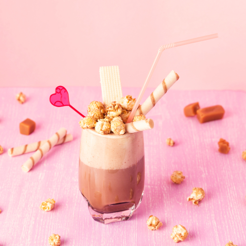 Grab the blender and grab some chocolate, it’s time to make a milkshake! Place milk and chocolate syrup in a blender and put on high speed for 2 seconds. Add your ice cream of choice, cover and continue blending but on low speed for 5 more seconds or until smooth. Grab your favourite glasses, pour the milkshake and grab some heart shaped candy, popcorn, strawberry wafer sticks and decorate!